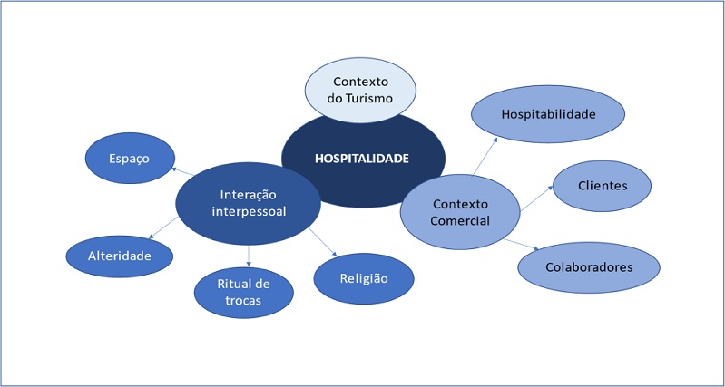 Conforme observado na figura 1, a hospitalidade no contexto da interação interpessoal foi dividida em religião, rituais de trocas, alteridade e espaço. A hospitalidade no contexto comercial foi dividida em hospitabilidade, a percepção da qualidade pelo cliente e a hospitalidade para os colaboradores. Não houve divisões para a hospitalidade no âmbito do turismo.