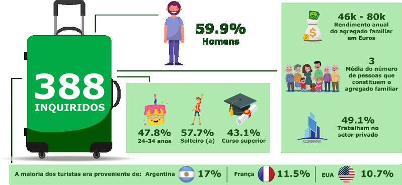 Os resultados obtidos na caracterização da amostra são similares à levantamentos anteriores realizados pela FIPE, sob encomenda para o Ministério do Turismo (Ministério do Turismo, 2019a; 2019b). A maioria dos entrevistados era do gênero masculino (59,9%), com a faixa etária entre 25-34 anos (47,8%), solteiros (57.7%), com curso superior (43,1%) e com trabalho no setor privado (49,1%). O rendimento anual familiar permeou o intervalo de 46.000 a 80.000 Euros. A maioria dos turistas era proveniente da Argentina (17%), França (11,5%) ou EUA (10,7%). Em média, a formação familiar era constituída por três pessoas. A caracterização da amostra pode ser verificada na figura 2 a seguir.