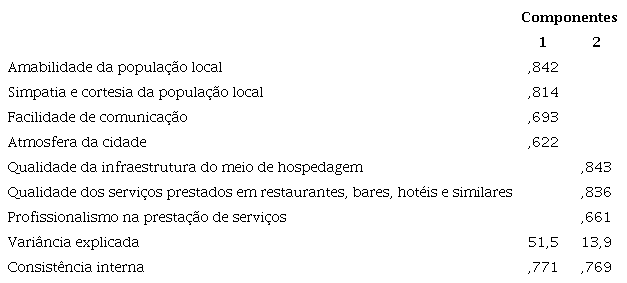 A análise da estrutura relacional das sete perguntas da escala de avaliação das características de hospitalidade foi validada pela análise fatorial realizada através do KMO (0.822, bom) e do teste de Bartlett (significativo) e indicou valores aceitáveis para a sua prossecução. A análise fatorial convergiu para uma solução com um componente principal. Como essa componente principal só explicava 51,5% da variância total optou-se por forçar a análise a duas componentes principais e obter um total de variância explicada de 65,4%, muito perto dos 70% indicado por alguns autores. O resultado pode ser verificado na tabela 2, onde a primeira componente tem a ver com a ‘amabilidade e simpatia da população’ e explica 51,5% da variância total enquanto a segunda componente está relacionada com as ‘infraestruturas da cidade’ e explica 13,9% da variância total. A consistência obtida foi superior a .70 (razoável).