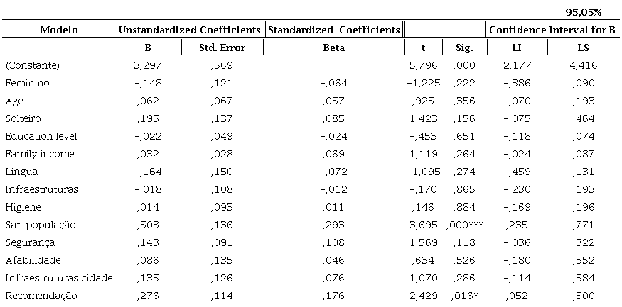 As variáveis ‘satisfação com a população’ (β = .293, p = .001) e ‘intenção de recomendação’ (β = .176, p = .001) revelaram-se preditores significativos da percepção da hospitalidade do Rio de Janeiro. Assim, quanto maior é a satisfação com a população e a intenção de recomendação, mais elevada é a percepção da hospitalidade do Rio de Janeiro.