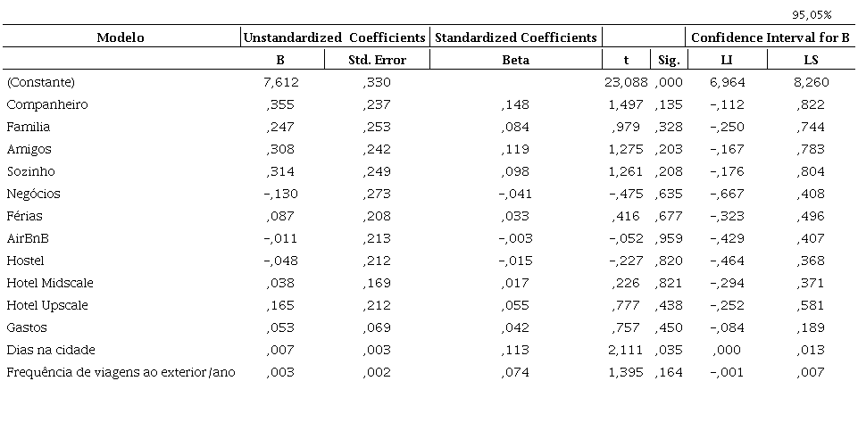 Para verificar se o comportamento de viagem influencia na avaliação da hospitalidade, realizou-se uma regressão linear múltipla hierárquica num terceiro bloco, com as variáveis ‘como viaja’, ‘gasto total aproximado na viagem’, ‘há quantos dias está na cidade’, ‘principal motivação para a viagem’, ‘principal meio de hospedagem utilizado’ e ‘média, por ano, de viagens para o exterior’ como variáveis independentes e a variável ‘percepção da hospitalidade do Rio de Janeiro’ como variável dependente (Tabela 5). O modelo explica 1% da variância total da percepção da hospitalidade e não é estatisticamente significativo, F (13, 367) = 1.044, p = .408.