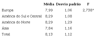 O resultado apontou que a nacionalidade de acordo com o continente influencia significativamente a avaliação da hospitalidade, F (3, 368) = 2.738, p = .043 (Tabela 6). O teste de comparação múltipla a posteriori indica que a percepção da hospitalidade é mais elevada nos países da América do Sul e Central quando comparados com a percepção nos países Europeus e Asiáticos.