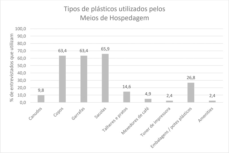 Dos MHs, 11% manifestaram estar perto de não mais usarem plásticos, permanecendo apenas os restritos às embalagens das mercadorias adquiridas de terceiros ou sacos para lixeira de banheiro. Nas palavras de uma gestora maranhense, “o consumo dos plásticos no hotel é mais relacionado às embalagens de produtos que não temos como eliminar [...] acredito que o problema esteja nos fornecedores”. Isto ilustra o problema da EC desde o processo produtivo e, por esta razão, são necessárias estratégias que facilitem mudanças nas indústrias que utilizam plásticos (Williams et al., 2016), a exemplo de incentivos financeiros e apoio dos governos à P&D (Schnurr et al., 2018).