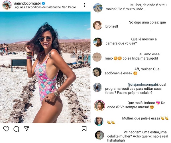 Nas páginas do “Viajando com Gabi” e “Viajo Logo Existo”, por exemplo, fica evidente a ideia da exibição de um modo de vida nômade em que a viagem é o cenário e os produtores de conteúdo os atores, que normalmente aparecem em primeiro plano. Eles utilizam suas próprias imagens, expostas em seus perfis na Internet, para vender produtos, serviços e ideias. Conforme podemos observar na imagem e comentários abaixo, a maior parte dos comentários se refere à Gabriela, sua roupa, sua forma física e aos equipamentos que utiliza para obter e tratar imagens. O cenário da viagem, e as informações constantes no texto, neste caso, ficam em segundo plano.