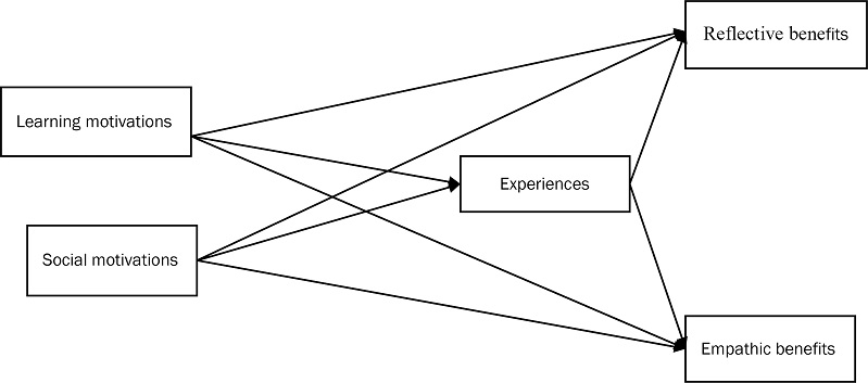 The model supported all relationships. The results indicated that the proposed model has an explanatory power of 28.9% for empathic benefits, 26.9% explanatory power for reflective benefits, and 23.7% explanatory power for experiments (Figure 2). These values represent an average explanatory power (Chin, 1998). One of the reasons for this result may be the existence of mediating and moderating variables to add to the proposed model. However, these results advance the scientific knowledge presented by Yan et al. (2016) and Otto and Ritchie (1996), reinforcing the relationship between learning and social motivation with experiences, as well as advancing the study by Kang (2010) relating these dimensions to benefits.
