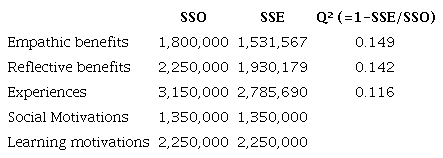 The results indicated that the Cohen f² values (see Table 7) presented loads lower than 0.02, which indicates unsatisfactory effects for endogenous latent constructs (Henseler, Ringle, & Sinkovics, 2009). Learning motivations impacted empathic benefits (f² = 0.232), experiences (f² = 0.162) and reflective benefits (f² =0.051). Social motivations impacted empathic benefits (f² = 0.029), reflexive benefits (f² =0.023) and experiences (f² =0.103). Finally, the experiences impacted the empathic benefits (f² =0.009) and reflective benefits (f² =0.115).