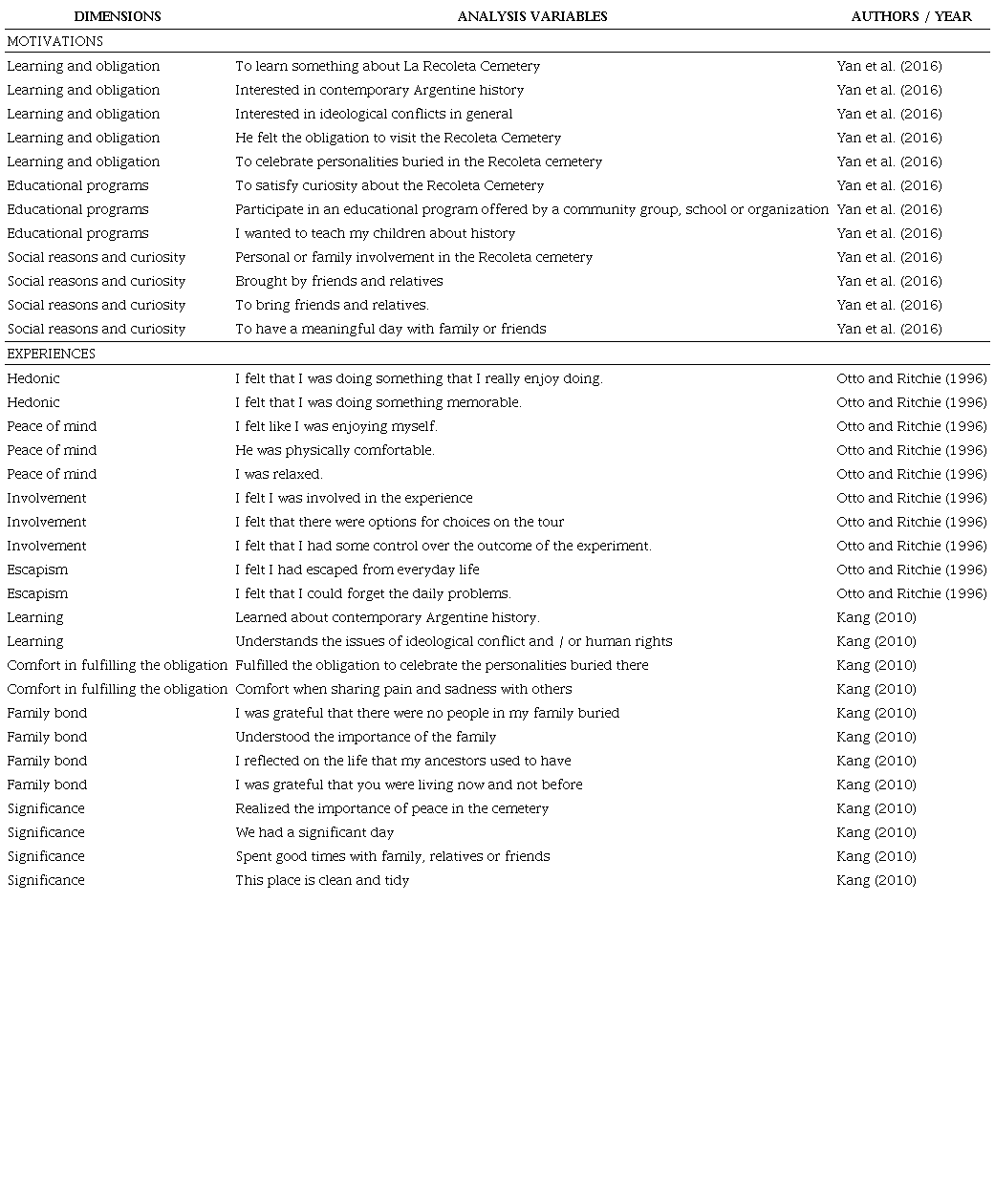 Although research in dark tourism has evolved, Podoshen (2013) claims that it is still in an embryonic stage and will require further exploration before it is possible to produce a generalisable theory. This investigation seeks to advance on three fronts: motivations, experiences, and perceived benefits. In recent years, motivation has emerged as a critical academic field in black tourism studies. With the exploratory factor analysis result, the motivation dimension was subdivided into two categories, called learning and social. Regarding the first, our study identified that tourists are motivated to visit a cemetery in search of acquiring knowledge, out of interest in the contemporary history of the country, and even to understand issues that are related to ideological conflicts or human rights; the cemetery hosts several personalities who lived in, and were party to, defining moments and eras of Argentinean history.