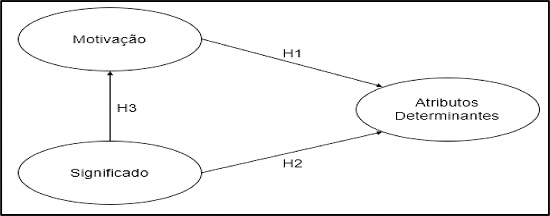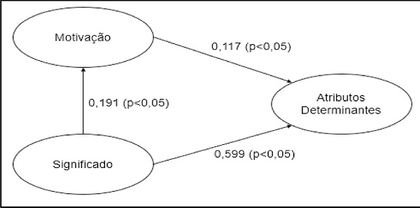 Para análise dos dados foi utilizado o software estatístico SPSS e AMOS. Utilizou-se de estatística descritiva (frequência, média e desvio-padrão) para avaliar o comportamento das variáveis em estudo, bem como traçar o perfil da amostra investigada. O grau de confiabilidade das escalas utilizadas foi testado por meio do alfa de Cronbach, que apresentou índice de 0,801 para o construto ‘motivação’, de 0,847 para o construto ‘significado’ e de 0,903 para ‘atributos determinantes’, sendo estes considerados aceitáveis, conforme argumentam Hair et al. (1998).