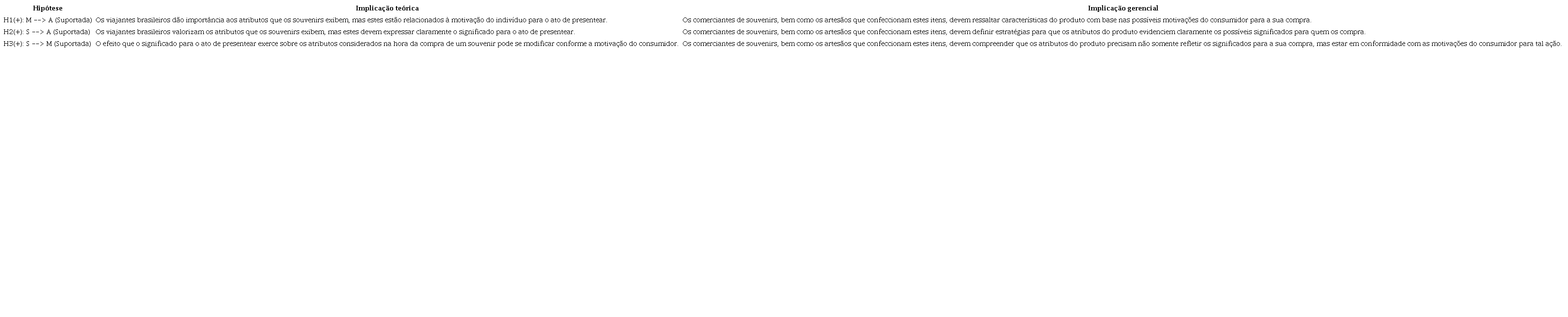 Por outro lado, a hipótese 3 do estudo sugeria a existência de relação positiva entre o significado para o ato de presentear e a motivação do viajante brasileiro para tal, o que alteraria o efeito daquele sobre os atributos exibidos pelos souvenirs de viagem. É possível observar na Figura 2 que, para os consumidores brasileiros entrevistados, a terceira hipótese analisada também foi confirmada. Isto significa que, com base nos dados desta pesquisa, a motivação modera a relação existente entre significado e atributos. Ou seja, acredita-se que o significado, que diz respeito às impressões do indivíduo acerca do sujeito presenteado (Wolfinbarger, 1990), esteja associado à motivação que, por sua vez, reflete a expectativa quanto ao ato de presentear (Alves et al., 2017). E, mais que isso, que essa relação afeta diretamente no efeito do significado sobre os atributos. Portanto, entende-se que, em termos de consumo, a análise da relevância dos atributos de um souvenir de viagem para a decisão de compra deve levar em consideração tanto os significados para o ato de presentear como a motivação do consumidor para tal. Com base no exposto, a Tabela 5 apresenta uma síntese das hipóteses analisadas neste estudo, sugerindo algumas das principais implicações teóricas e gerenciais para o campo do turismo.