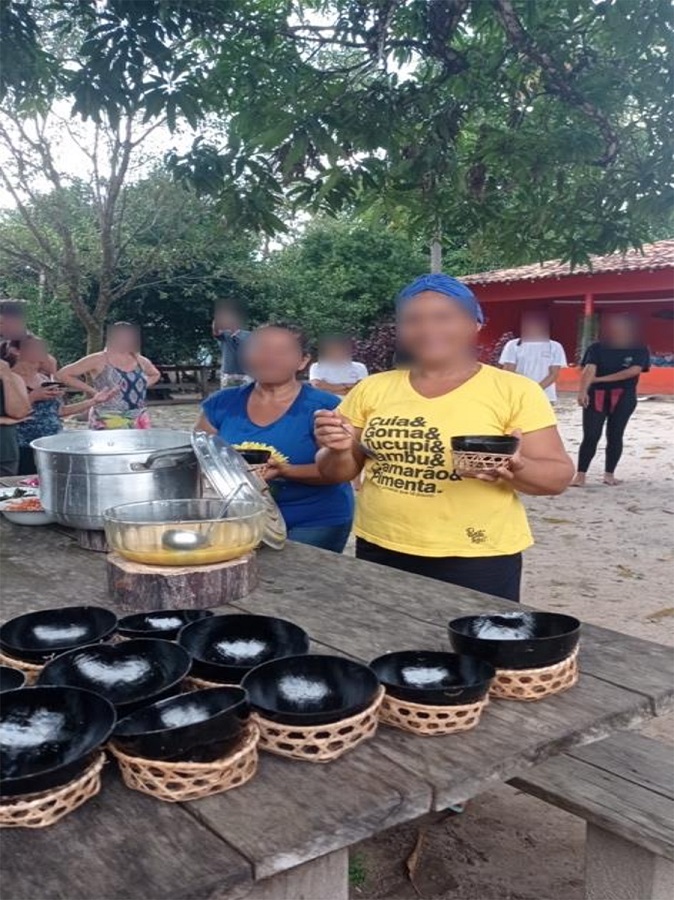 No primeiro dia os turistas são recepcionados na sede do instituto, uma casa simples com conforto nos moldes da tradição local. Os visitantes são acolhidos pela comunidade em uma roda de conversa durante o ritual do tacacá (figura 3), que tradicionalmente acontece no final do dia quando o sol baixa (Macêdo, 2020). Neste momento encontram-se as mulheres do instituto, suas famílias, moradores vizinhos, organizadores e o grupo visitante. E com as cuias de tacacá em mãos, reunidos em círculo, um por um dos convivas faz a apresentação pessoal e compartilha um pouco da experiência de vida.