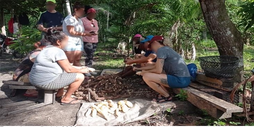 Todas essas etapas ocorrem para a produção da farinha de mandioca, sendo que para os outros produtos como beiju de massa, goma, farinha de tapioca, tucupi e puba, é possível que aconteçam paralelamente com a logística de produção que as famílias organizam. As famílias podem ser parentes de distintos graus de parentesco, mas que se organizam para o trabalho da farinha levando em conta que a mestre do grupo é a Dona Joana Laura. Estrutura social semelhante como vista aqui: