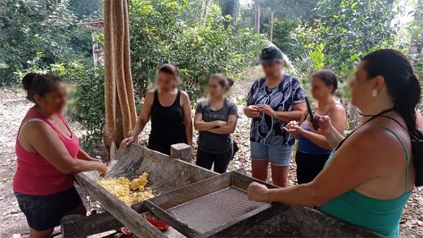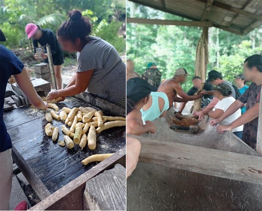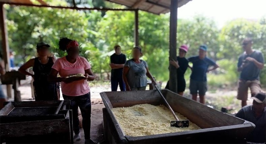 As atividades do terceiro dia começam cedo, às sete horas, com o deslocamento dos participantes para o roçado atrás da casa da Família Rodrigues, onde está situada a casa de farinha (figura 4) comunitária na qual Dona Joana Laura, mestre farinheira do instituto, é a responsável. A primeira parte do rito é levar os participantes até o roçado de mandioca, para compreenderem o processo inicial do sistema agrícola da mandioca brava. Após a colheita, o grupo de turistas parte para a Casa de Farinha e nela participam de todos os processos de produção do sistema culinário da mandioca.