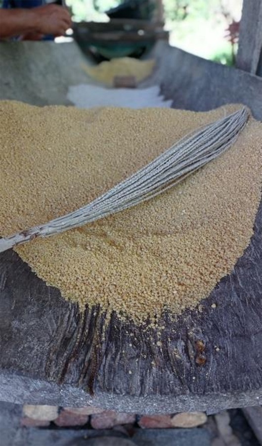 Na casa de farinha ocorrem as principais etapas da produção dos subprodutos da mandioca (van Velthem, 2007). Para Pinto e Waldeck (2006) falar desse local de produção no singular é não ter consciência da variedade de estruturas e logística de produção que estão presente por todo território nacional. É nesse espaço que a dimensão simbólica se manifesta em diferentes processos e objetos mediante a integração dos saberes geracionais e gestuais, das variedades de mandioca e da tecnologia artesanal que fazem parte do fluxo no fabrico dos alimentos provenientes desse insumo.