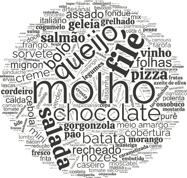 Se consideramos os termos utilizados para descrever estes novos elementos, observamos (Figura 03) que aqueles com maior destaque foram: molho (termo utilizado em 27 elementos), filé (18), queijo (17), chocolate (14), salada (9) além da pizza (9).