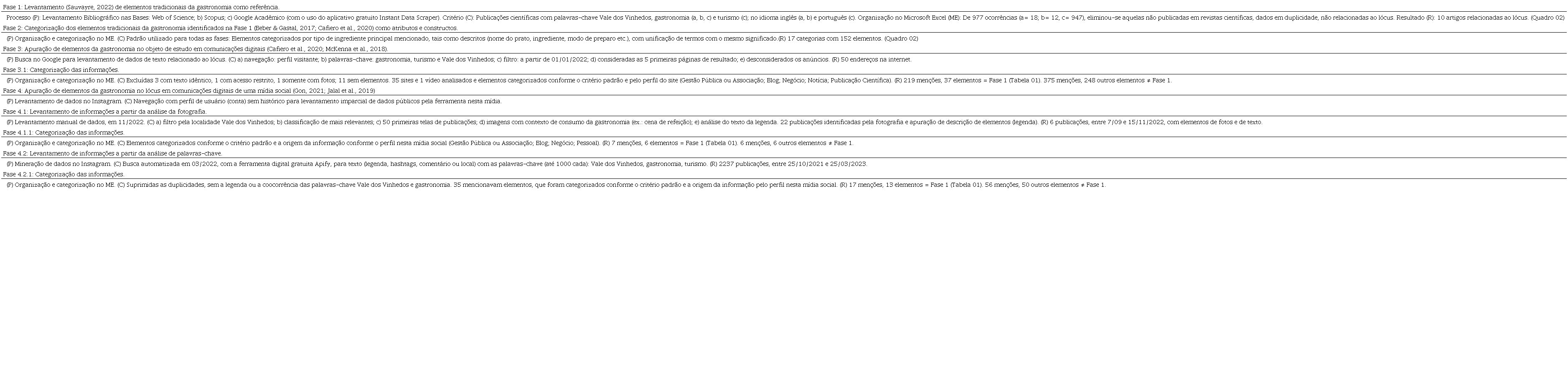 Na primeira fase (fase 1) de processos realizou-se levantamento pelo método dedutivo, no qual buscou-se em base de dados de publicações científicas referências para o estudo, visando identificar elementos da gastronomia, aqui nomeados como tradicionais, como unidades de análise para as fases seguintes.