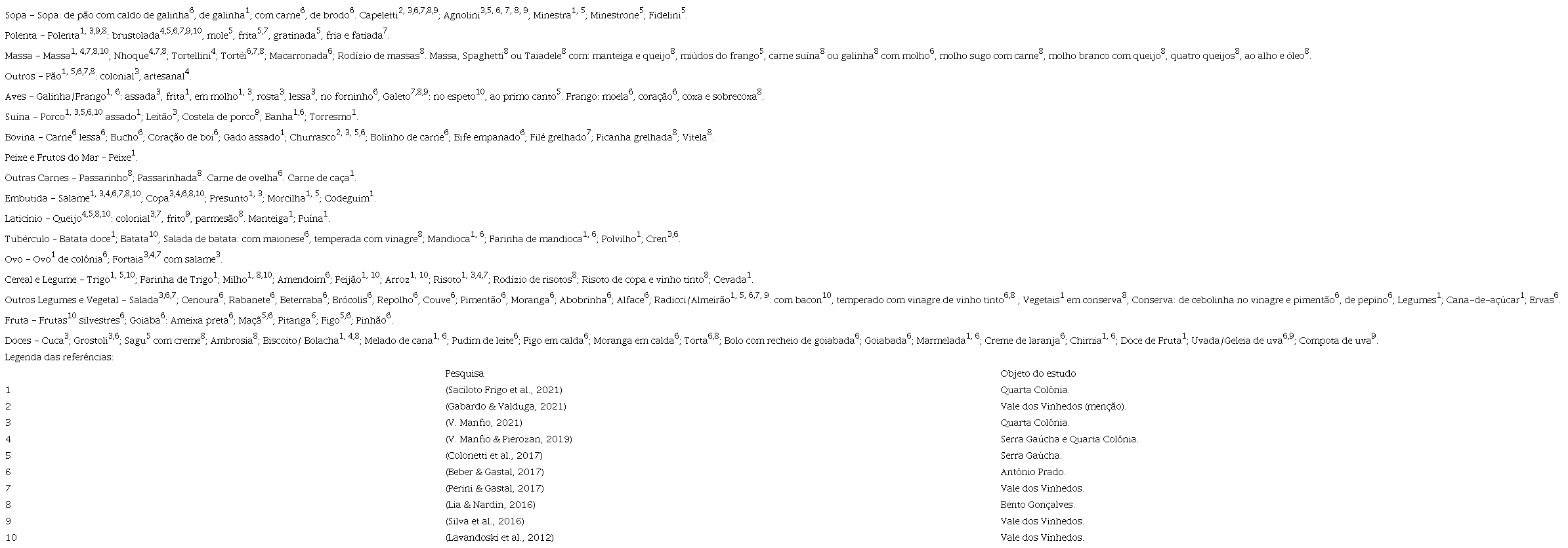 Com base nesta bibliografia, realizou-se a fase 2 seguindo uma combinação do modelo de Cafiero et al. (2020), no qual o ponto de partida foi uma lista de elementos produtos agroalimentares tradicionais agrupados em categorias, e do padrão de constructos utilizados por Perini e Gastal (2017), o qual apresenta uma lista de ingredientes presentes nas receitas do livro Colônia Italiana, também agrupados por categorias.