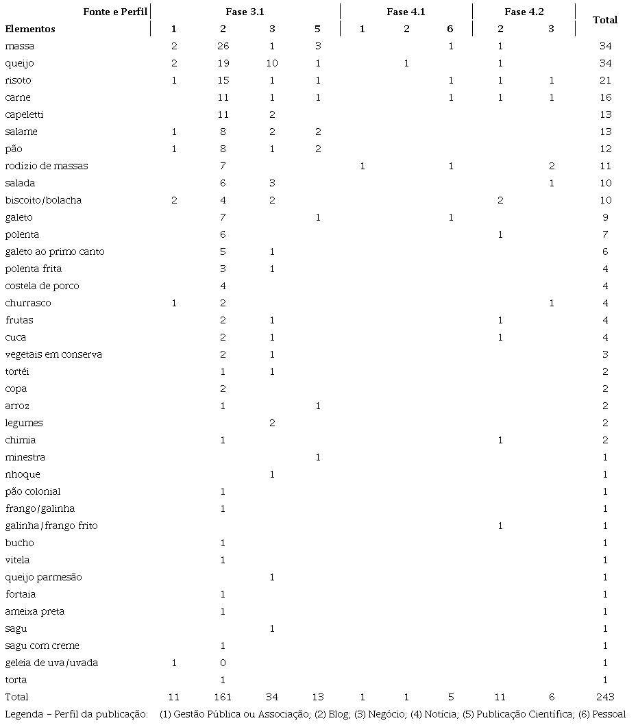 Como mencionado, nestas duas últimas fases (3 e 4) houve um número de novos elementos (Figura 03) muito superior aos tradicionais (fase 1 e 2). Ainda que a variação entre ambos não representasse modificação significativa no elemento da gastronomia em si, considerou-se tal qual como foram descritos nos dados apurados, uma vez que a forma de comunicar a informação também fez parte deste estudo.
