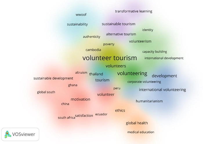 Inicialmente, verificaram-se os temas de ocorrência na pesquisa sobre volunturismo em uma década (2011-2020) até o dia 29 de junho de 2021, recuperaram-se na base Scopus documentos indexados a partir dos termos de busca volunteer tourism e voluntourism. Realizou-se a análise de coocorrência (mínimo de 5 ocorrências por palavra) das 1.703 palavras-chave identificadas com o suporte do software VOSviewer versão 1.6.16. Pôde-se verificar a formação de sete clusters principais formados por palavras com maior recorrência apresentadas a partir da visualização de densidade do VOSviewer em que se evidencia a intensidade de cada item por meio da coloração mais escura (maior recorrência) ou mais clara (menor recorrência), como se vê na Figura 1.
