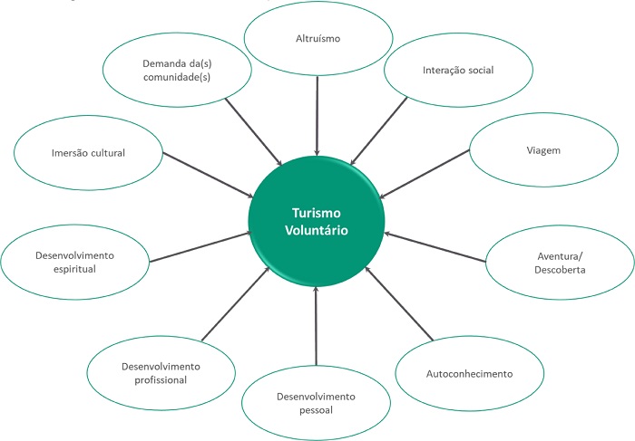 Grabowski (2013) verificou a ocorrência dos seguintes fatores motivacionais: o altruísmo; a viagem por si só; a aventura ou descoberta; a interação social; o desenvolvimento pessoal; o desenvolvimento profissional; a imersão cultural; o fato de estar na hora certa ou lugar certo. Diferentemente de uma viagem ou férias convencionais, o volunturismo permite aos turistas visitarem e explorarem lugares aos quais não teriam acesso. Além disso, proporciona a possibilidade de interação com residentes que não encontrariam nos hotéis ou pontos turísticos do destino, favorecendo a criação de amizades para toda a vida e a satisfação com a experiência de viagem (Chen et al., 2015).