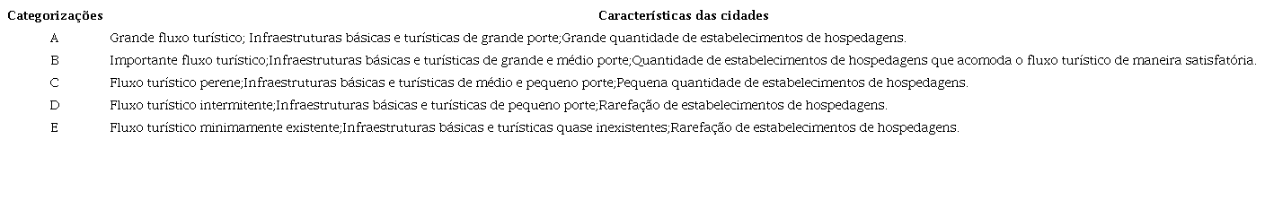 Com base nesses indicadores, o Ministério do Turismo criou – e ainda utiliza – uma ferramenta de classificação dos municípios turísticos, dividida em cinco categorias: de A a E. Os municípios classificados como “A” possuem um fluxo turístico consistente e uma ampla infraestrutura turística e estão no topo dessa hierarquização; já os municípios “E” apresentam um fluxo turístico modesto e escassez de infraestrutura. Os municípios classificados como B, C e D estão em posições intermediárias. Quanto melhor a categorização, maior é a diferenciação e o destaque de um território em relação aos outros, conforme o Quadro 1.