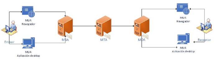Para el correcto funcionamiento del servicio de correo electrónico influye un conjunto de tecnologías básicas, las cuales están relacionadas entre sí. Cuando un emisor envía un correo electrónico hacia un receptor, lo hace a través del agente de mensaje de usuario (MUA), el cual puede ser un navegador o una aplicación de escritorio. Este, a su vez, le entrega el mensaje al agente de envío de correo (MSA) el cual impone requisitos, como el permiso de acceso y hace que el correo se adhiera a los estándares de internet. El MSA hace entrega del mensaje al agente de transferencia de correo (MTA), el cual enruta y retransmite el correo de host a host. El MTA le envía el correo al agente de entrega de correo (MDA) y este hace llegar el mensaje al buzón del receptor, el cual puede consultado desde su MUA (Figura 1).