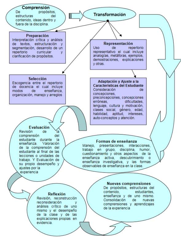 Para favorecer la integración de dichos conocimientos en el ejercicio práctico del docente, Shulman propuso el modelo de razonamiento y acción pedagógica en el que sugiere que el docente antes de llevar a cabo el proceso de enseñanza de una temática en particular ha de realizar un análisis de los objetivos de enseñanza y de lo que se quiere alcanzar. Posteriormente, desarrolla el proceso práctico en el cual, a partir de distintas estrategias, se enseñe el conocimiento de los contenidos de forma más representativa a los estudiantes y, finalmente, realice las reflexiones para configurar un nuevo pensamiento desde lo desarrollado y la generación de nuevas estrategias a favor del aprendizaje de los estudiantes (Shulman, 2005; Salazar, 2005; Acevedo, 2009). Es por ello por lo que el modelo de razonamiento y acción pedagógica de Shulman busca señalar un ciclo a través de actividades de razonamiento, ejercicio práctico y nuevas reflexiones donde el punto de partida y de llegada de cada ciclo es un acto de comprensión sobre la actividad docente (figura 2). Dicho modelo de razonamiento y acción pedagógica se encuentra integrado por las siguientes actividades propias del docente: comprensión, transformación, enseñanza, evaluación, reflexión y nueva comprensión.