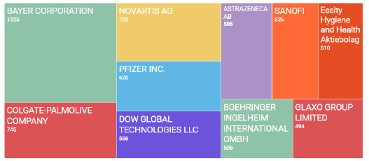 En una aproximación más directa a las personas, se destaca que las empresas extranjeras con mayor número de solicitudes de patente en Colombia pertenecen al sector farmacéutico o químico. Entre ellas, las farmacéuticas: Bayer, Novartis, Pfizer, Astrazeneca, Sanofi y Boheringer Ingelheim, así como la empresa Dow Global Technologies del sector agro industrial, lo cual no corresponde con el comportamiento que se tuvo a nivel mundial entre los años 2013 y 2015, periodo en el que la mayoría de las empresas que encabezan las solicitudes de patente en el mundo pertenecen al sector informático y de telecomunicaciones (World Intellectual Property Organization, 2018, p. 51), entre las que se encuentran compañías como Canon, Samsung, Huawei, ZTE y Qualcomm.