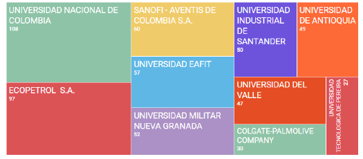 Para el caso de las universidades, se destaca que aun cuando según cifras del Ministerio de Educación Nacional para el 2016 existía un registro de 287 instituciones de educación superior. Siendo este grupo el que más relación tiene con la generación y apropiación de conocimiento, encontrar que tan solo una tercera parte del total esté relacionada con patentes sugiere un escaso interés desde este sector por generar nuevo conocimiento o conocimiento tecnológico aplicado a las problemáticas industriales y económicas del país.