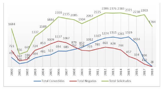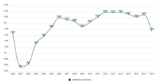 Una primera aproximación que permite la confrontación de esta hipótesis corresponde al estado de las solicitudes de patente en el país del 2000 a 2018, con lo cual se propone abordar el sistema de patentes que va más allá de la simple cuantificación de solicitudes y busca ofrecer un panorama del estado de estas desde el punto de vista de la protección existente. Así como una caracterización general en términos de los solicitantes por tipo y origen geográfico.