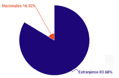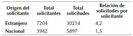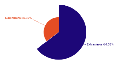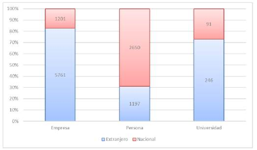 En la Figura 3 se presentó la distribución de solicitudes según su origen entre nacionales y extranjeros. Allí se observa que el 83 % del total de las solicitudes son presentadas por extranjeros, mientras que como se muestra en la Figura 7, visto desde el total de solicitantes los extranjeros representan el 65 % de las personas relacionadas en los registros obtenidos. Esto indica que mientras que para los extranjeros se encuentra que por cada solicitante en promedio hay más de cuatro solicitudes de patente, en el caso de los nacionales, la relación es casi 1 a 1, con 1,5 solicitudes por cada solicitante, relación detallada en la Tabla 1.