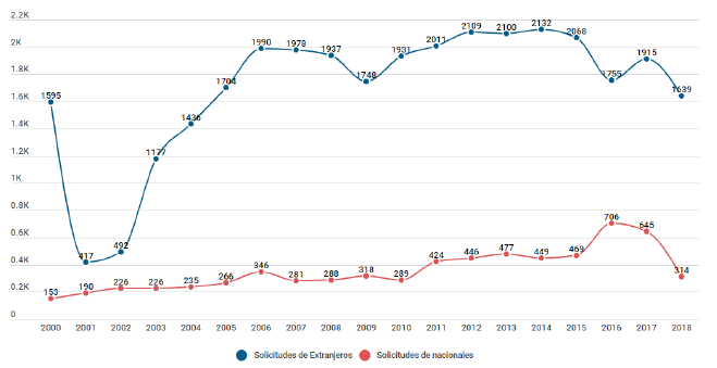 En una aproximación más cercana a los datos se encuentra que de estos 36 111 registros, 5897 corresponden a solicitudes presentadas por nacionales (residentes en Colombia), lo que representa un 16 %; mientras que por parte de extranjeros se registra el 84 % (30 214). En las Figura 3 y 4 se presenta en detalle esta distribución, así como el comportamiento año a año.