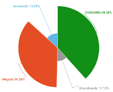 Teniendo en cuenta que las patentes que se encuentran caducas corresponden a aquellas que fueron otorgadas, pero sobre las cuales dejó de pagarse la anualidad para su mantenimiento, podemos afirmar que el total de patentes concedidas corresponde a aquellas que se encuentran activas más las que han caducado y las que pasaron a dominio público. De acuerdo con esto, más de una tercera parte de las solicitudes presentadas, 38 % (13 822), corresponde a aquellas que han sido concedidas; mientras que un número muy cercano (35 %, es decir, 12 534) han sido negadas, como se muestra en la Figura 5. Esto muestra que tan solo poco más de la tercera parte de las invenciones registradas en el país cuentan o han contado con la exclusividad para su explotación.