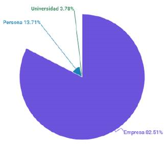 También es importante identificar el tipo de solicitante según su naturaleza. Para esto se establecen tres grupos de interés: empresas, universidades3 y personas naturales. Encontrando que la mayoría corresponden al primer grupo con un total de 6962 de los 11 146 (62 %), mientras que el menor número de solicitantes corresponde a universidades con tan solo el 3 %, como se muestra en la Figura 8.