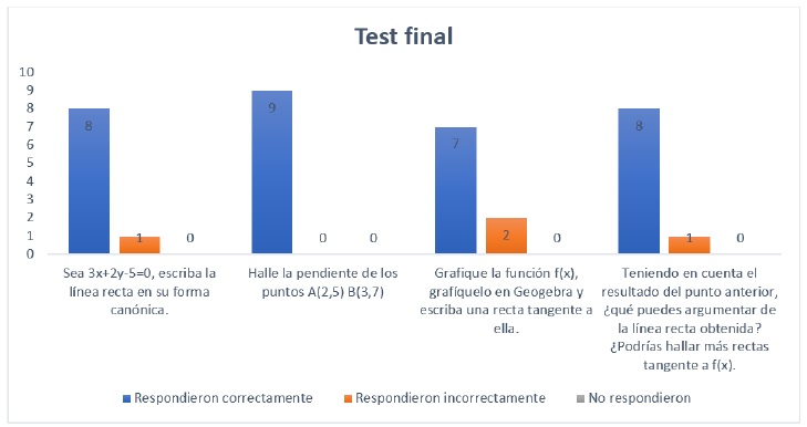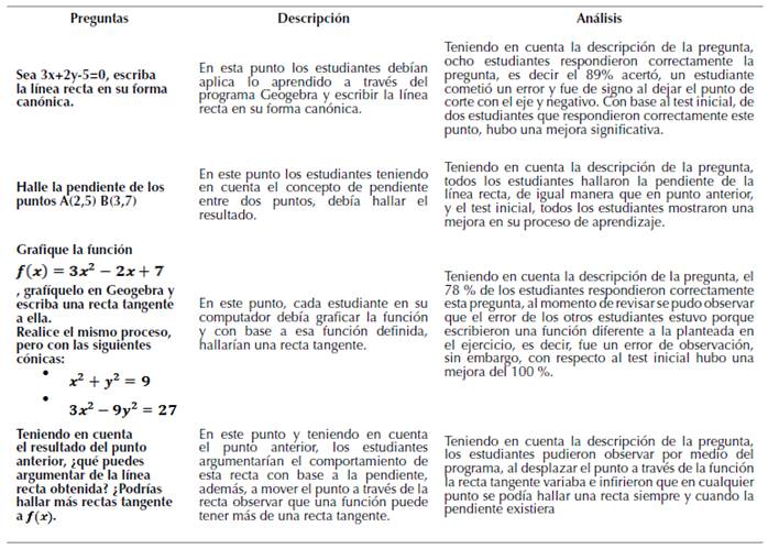 En relación con los objetivos del presente artículo, se realizó un estudio, utilizado un test inicial y un test final con la muestra seleccionada, para determinar la implementación de la propuesta pedagógica es efectiva para la interpretación geométrica de la recta tangente.