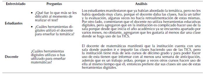 Ahora procederemos a realizar el análisis las entrevistas realizadas a los estudiantes y al docente de matemáticas, esta entrevista se realizó de manera no estructurada, el cual permite que los entrevistados den su opinión con respecto a una pregunta planteada y no limitarse a unas respuestas específicas.