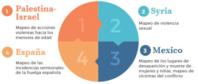 En los antecedentes del crowdmapping, para los mapeos colaborativos se empleó la tecnología de Ushahidi-crowdmap, esta es una herramienta cartográfica interactiva que permite informar en territorios de catástrofe, violencia o conflicto, creando un archivo temporal y geoespacial de los sucesos (Martínez, Rodríguez y Vera, 2016). Algunos de los mapeos de denuncias por manifestaciones de violencia se encuentran relacionados en los siguientes países: Palestina, Israel, Siria, México, España; su objetivo era incursionar sensores humanos para tener una mayor visibilización de las víctimas del conflicto. A continuación, se relaciona la finalidad de los mapeos según cada país.