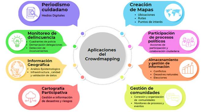 El crowdmapping permite crear mapas con el fin de visualizar los datos o la información clara y concisa, dichos mapas pueden mostrar la evolución cronológica, información actualizada y sintetizada según el fin para el que vaya a ser implementado. En la Figura 2 se pueden observar las diferentes aplicaciones del crowdmapping.