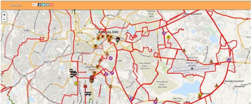 El crowdmapping no solo se enfoca en colaborar en situaciones de crisis o desastres, también puede mapear cultura, entretenimiento y diversas áreas de interés. El mapeo de rutas para biciusuarios es un apoyo a la movilidad urbana que contribuye a un mejoramiento en sectores económicos, sociales y ambientales. Un caso particular de un crowdmapping que se llevó a cabo en la cuidad de Bangalore (India) permitió mapear rutas para biciusuarios, imágenes de las rutas, puntos problemáticos y talleres de reparación, todo gracias a la colaboración inicial de los ciclistas, en la siguiente figura se puede observar el mapeo (Segundo y da Silva, 2016).