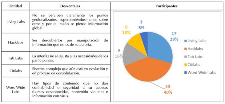A partir de las entidades mencionadas con anterioridad, Laura Gallardo Escalona realizó una investigación como trabajo de grado “Open social learning Crowdmap. Building alternative ways…” con el objetivo de analizar la funcionalidad de la plataforma OSL Crowdmap, es decir, si favorece la difusión y la creación de conocimientos, la interacción y la comunicación entre los participantes (Gallardo, 2013). En la Tabla 1 se recopila la información en la cual se muestra la cantidad de participantes que escogieron cierta categoría y la desventaja que presenta cada una de estas.