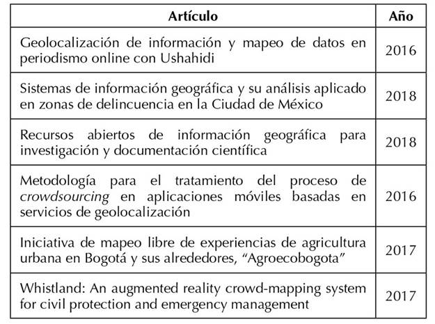 Con base en el objetivo del artículo, se determinó que para esta revisión solo se tendrían en cuenta artículos o documentos procedentes de revistas científicas o investigativas, reportes, artículos o tesis sobre el tema. La búsqueda de aquellos artículos se realizó por palabras o conceptos clave, por ejemplo: “crowdmapping”, “mapeo”, “mapa informativo”, “mapa colaborativo”, “proyectos de mapeo”, “mapeo biciusuarios”, “delimitación predios”, “mapeo lugares”, entre otros, dichas búsquedas se realizaron en español, inglés y muy pocos en portugués, debido a que son los idiomas predominantes para la publicación de estos documentos.
