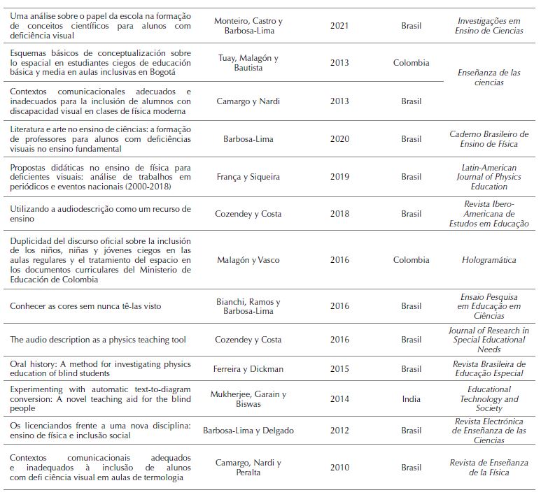 La mayor parte de las investigaciones se localizan en Brasil. Se asume que se da esta situación por las siguientes razones: en el país se ha dado un avance frente a la política pública y a la normatividad establecida para la atención a la educación especial y la inclusión de personas en condición de discapacidad, además, se ha generado una serie de programas escolares que se adaptan a las necesidades de los estudiantes (Cordova et al, 2018), sumado a esto, existen varios grupos de investigación, uno de ellos cuenta con la experiencia de un maestro con DFV, el doctor Eder Pires de Camargo, quien ha centrado su interés en configurar investigación en el campo en términos didácticos y comunicativos; asimismo, Azevedo y Santos (2014)b y Silva y Santos (2018) se han preocupado por la fabricación de recursos táctiles que permiten la inclusión de estudiantes con DFV en clase de física. Por otro lado, el investigador Barbosa-Lima (2012), 2020 ha establecido diferentes estrategias, basadas en el arte, la narrativa, el lenguaje, que permiten la aproximación de estas comunidades al estudio de los fenómenos que se enmarcan en la disciplina.