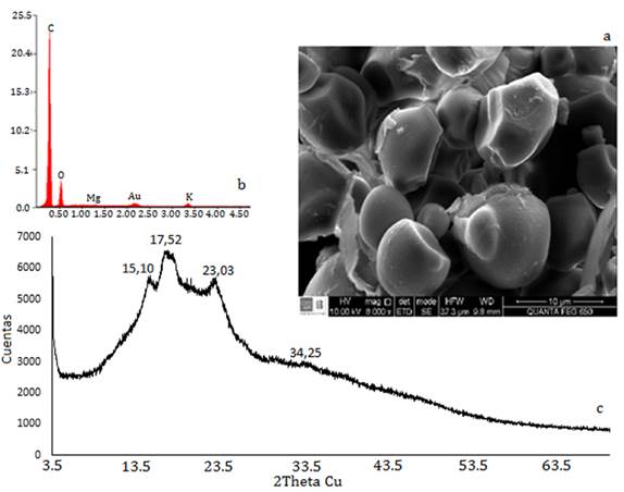 El biochar, según el análisis SEM (Figura 3a), presentó una morfología esférica con diámetros alrededor de 10 µm y de superficie lisa, lo cual facilita su uso en catálisis, almacenamiento de gases, mejores propiedades eléctricas, ópticas y térmicas que permiten una alta relación superficie-volumen, aislamiento térmico y una alta estabilidad fisicoquímica (Soni y Karmee, 2020; Yang et al., 2017). El análisis elemental EDS (Figura 3b) evidenció que el material tiene C y O en un porcentaje en peso de 67,67 % y 20,36 % respectivamente. Lo anterior es característico de un carbono procedente de biomasa lignocelulósica con pirólisis, lo cual se corrobora con los máximos de difracción 15,10, 17,52, 23,03 y 34,25° (2 theta) (Figura 3c), estos resultados son similares a los obtenidos para la harina de yuca por Lopattananon, Thongpin y Sombatsompop (2012), lo que permite establecer que el biochar obtenido conserva una estructura de almidones cristalinos del tipo A (Zhang et al., 2020).