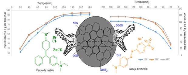 Para la remoción de los colorantes, se utilizaron muestras de 0,15 g de biochar que se disolvieron en 300 mL de solución de naranja de metilo de 30 mg/L, las cuales se agitaron a 760 rpm por 30 minutos, al término del tiempo, las mezclas se filtraron y se analizaron a una longitud de onda máxima de 454 nm por espectroscopía UV-Vis, empleando un espectrómetro Shimadzu UV-2401PC, celda de cuarzo de 1 cm. Se utilizó como blanco una solución obtenida del lavado de 0,15 g de biochar con 30 mL de agua destilada por 30 minutos. Para la cuantificación de la concentración de colorante se realizó una curva de calibración con el blanco como diluyente a 0, 2, 4, 6, 8, 10 y 12 mg/L de naranja de metilo. El estudio de remoción se repitió por quintuplicado. El procedimiento descrito se replicó para la remoción del verde de metilo. En este caso, la curva de calibración se realizó con las siguientes concentraciones del colorante: 0, 1, 2, 3, 4, 5 y 6 mg/L, y se analizó a una longitud de onda máxima de 631 nm.