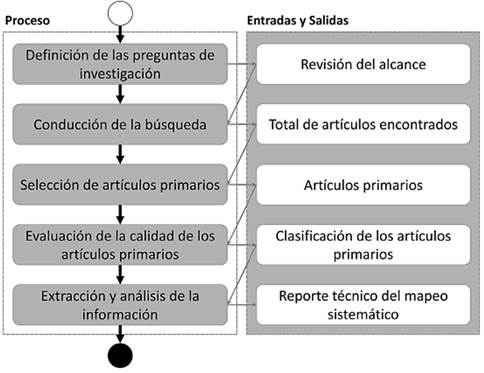 El MSL presentado sigue los lineamientos de Petersen et al. (2015); Kitchenham y Charters (2007) y Budgen et al. (2008), para las actividades: (i) definición de las preguntas de investigación; (ii) conducción de la búsqueda de artículos relevantes; (iii) selección de artículos primarios aplicando criterios de inclusión y exclusión; (iv) evaluación de la calidad de los artículos primarios; y (v) extracción de información. En la Figura 1 se presenta proceso, actividades, entradas y salidas obtenidas en la búsqueda.