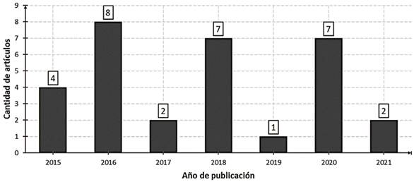 De acuerdo con los resultados presentados en la Figura 2, se puede observar que la producción científica en el año 2015 fue del 12,9 % (A2, A10, A25, A28), en 2016 del 29 % (A4, A9, A11, A12, A24, A27, A29, A31), en 2017 del 6,45 % (A5, A15), en 2018 del 22,58 % (A3, A6, A7, A18, A23, A26, A30), en 2019 del 3,22 % (A14), en 2020 del 22,58 % (A1, A8, A13, A16, A17, A21, A22) y en el 2021 del 6,45 % (A19, A20).