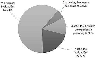 Según las características de la investigación desarrollada en los AP se realizó una clasificación basada en seis categorías: validaciones, evaluaciones, propuestas de solución, artículos filosóficos, artículos de opinión y artículos de experiencia personal (Wieringa et al., 2006). De acuerdo con esto, los resultados obtenidos son los siguientes: 21 artículos (67,74 %) ejecutan métodos de evaluación a través de estudios de campo, estudios de caso, encuestas o combinaciones de ellos; 7 artículos (22,58 %) realizan procesos de validación a través de mecanismos como revisiones de la literatura y experimentos; 4 artículos (12,90 %) describen la experiencia personal presentada por los autores luego de realizar procesos de investigación en empresas de software; 2 artículos (6,45 %) realizan propuestas de solución en las cuales se proponen ontologías y definiciones conceptuales enfocadas en la documentación de software y su relación con la deuda técnica. Finalmente, no se identificaron estudios de tipo filosófico o de opinión. Lo mencionado se muestra en la Figura 3, pero los detalles de la clasificación de los artículos pueden ser consultados en el siguiente enlace: https://bit.ly/3Z5tmzV.