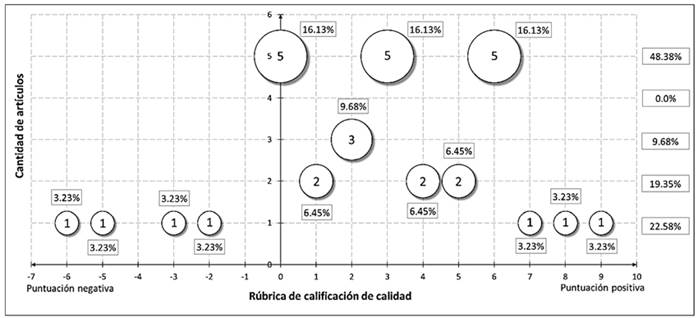La Figura 4 presenta la agrupación de artículos según la calificación obtenida tras la suma de los valores individuales propuestos para llevar a cabo la evaluación de la calidad de los estudios. De acuerdo con los resultados, se puede observar que: el 6,45 % de los artículos (A11, A4) lograron la calificación más alta con 9 y 8 puntos respectivamente, el 3,23 % (A28) con 7 puntos, el 16,13 % (A1, A2, A20, A21, A27) con 6 puntos, el 6,45 % (A24, A25) con 5 puntos, el 6,45 % (A23, A29) con cuatro puntos, el 16,13 % (A3, A14, A17, A22, A26) con 3 puntos, el 9,68 % (A8, A12, A30) con 2 puntos, el 6,45 % (A13, A18) con 1 punto, el 16,13 % (A5, A10, A15, A16, A31) con 0 puntos y el 3,23 % (A19, A7, A9, A6) con -2, -3, -5 y -6 puntos respectivamente.