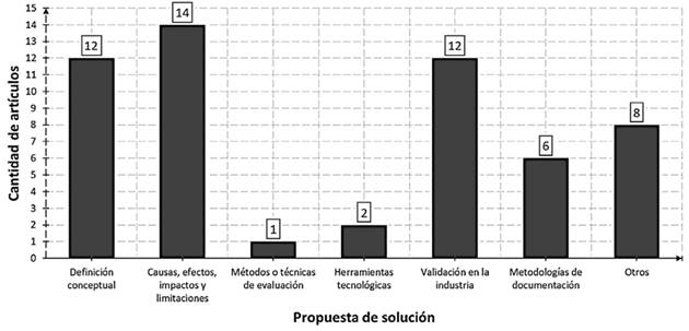Con relación a la definición de procesos, técnicas, métodos y soluciones, se identificó que: 1 estudio (3,23 %) (A7) presenta un conjunto de métricas para medir la DD, sin embargo, no se presenta el detalle de las métricas. Por otro lado; 2 estudios (6,45 %) (A3, A7) proponen herramientas para la prevención de la DD durante la etapa de especificación de requisitos ágiles y para permitir la visualización y accesibilidad de la documentación en los proyectos, respectivamente; 12 estudios (38,71 %) (A3, A5, A7, A14, A15, A17, A20, A21, A22, A25, A26, A27) realizan estudios aplicados en la industria a través de cuestionarios que permiten identificar aspectos que generan deuda de proceso y deuda de la documentación en empresas desarrolladoras de software; 6 estudios (19,35 %) (A5, A9, A12, A13, A24, A25) proponen metodologías para llevar a cabo la gestión de la documentación a través de la identificación de artefactos que generan deuda técnica y el uso de lenguaje natural; finalmente, 8 estudios (25,81 %) (A1, A5, A6, A11, A19, A21, A24, A31) presentan otros enfoques de solución, tales como: prácticas de documentación para mitigar la DD (A1), estudio de la DD a nivel de código fuente a través de comentarios de código (A10, A22, A23, A27), antipatrones de documentación (A19) y un modelo de vocabulario para contextualizar los conceptos de DD (A21).