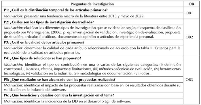 En la Tabla 1 se presentan las preguntas de investigación y el OB asociado para categorizar la información relevante sobre la DD en el desarrollo ágil de software.