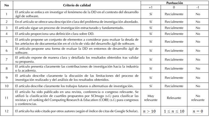 Con el propósito de medir la calidad de los artículos primarios y determinar su grado de pertinencia con respecto a la DD en el desarrollo ágil de software, se diseñó un método de evaluación basado en doce criterios con una puntuación de tres valores: no cumple (-1), cumple parcialmente (0) y sí cumple (+1) (Kitchenham y Charters, 2007). Así cada artículo puede obtener una calificación entre -12 y +12. No obstante, el objetivo de evaluar la calidad de los estudios es identificar aquellos que son más pertinentes para la investigación, por lo que una puntuación baja no es un criterio de exclusión. Los criterios de evaluación de la calidad se presentan en la Tabla 2.